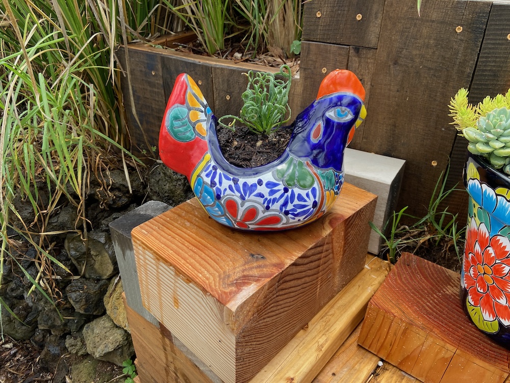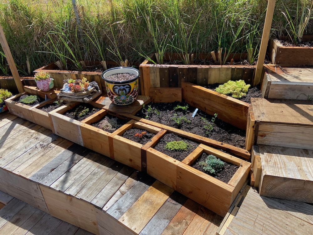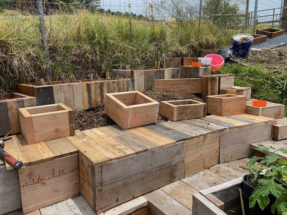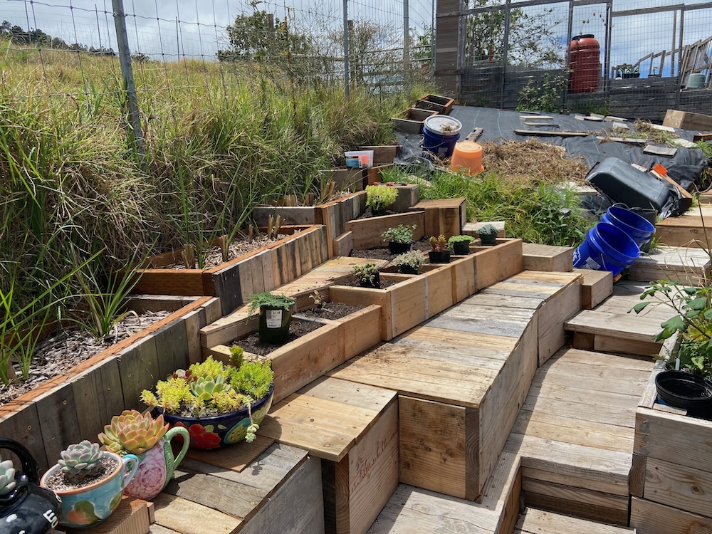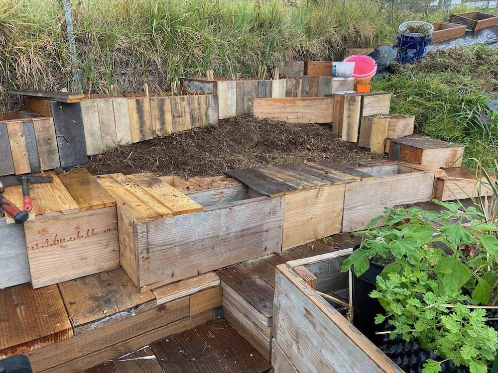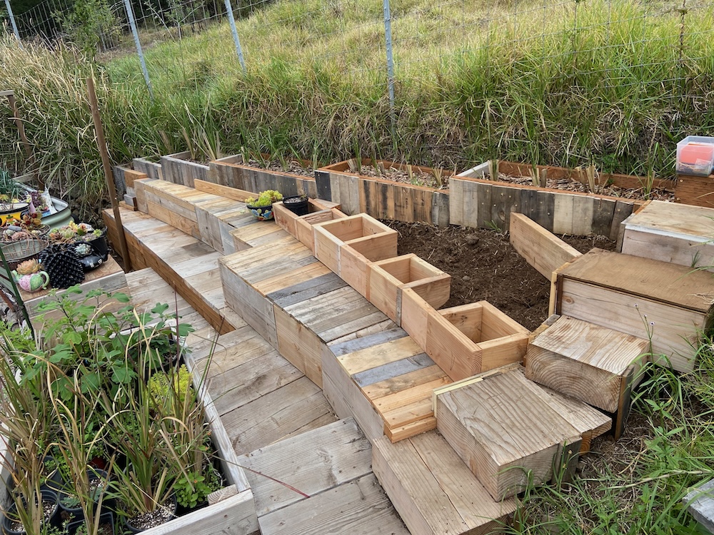 The guys generate a lot of scrap and I’m using it to build planter boxes and mini decks and stairs. This triangular area has a lot of old lava flow that can’t be moved without a jack hammer. So I just build around it. I’ve started using some pallet wood for some of the decking.