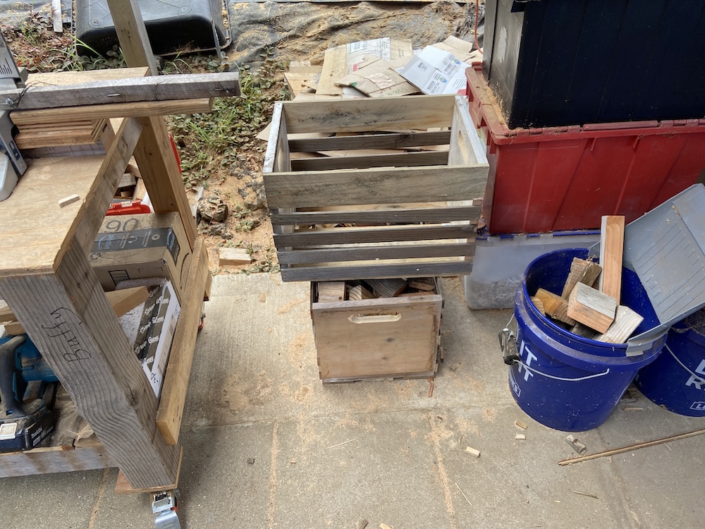 I too generate scrap that is usable kindling. Knocked together these crates out of pallets and some old leftover shelving from 3 houses ago. Reuse!