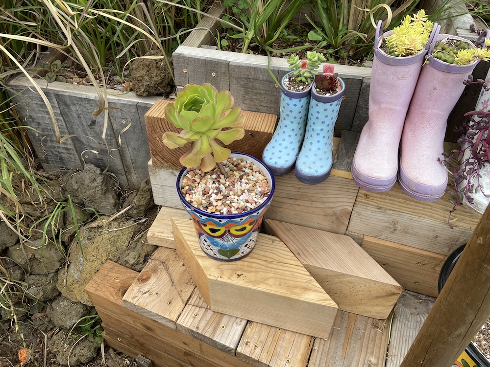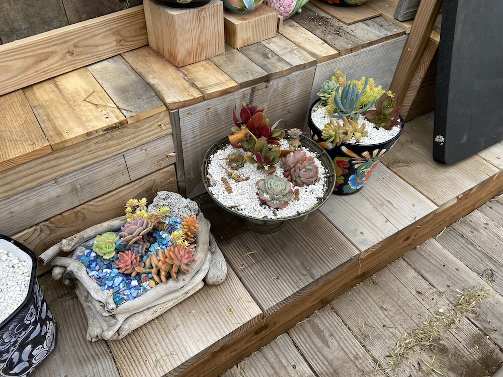 Some of my succulent planters. The driftwood one I built.